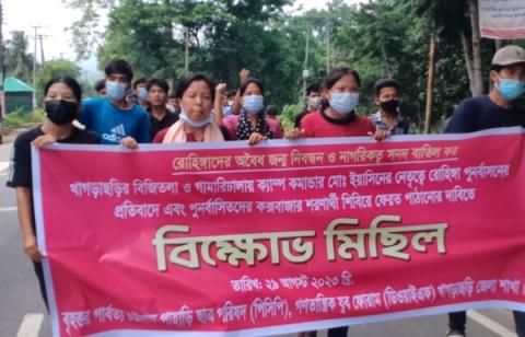 পাহাড়ি ছাত্র পরিষদ খাগড়াছড়ি জেলা শাখার দপ্তর সম্পাদক প্রাঞ্জল চাকমা প্রেরিত এক সংবাদ বিজ্ঞপ্তিতে জানান, খাগড়াছড়ি সদর উপজেলার বিজিতলা ও গামাঢ়িঢালায় রোহিঙ্গা পুনর্বাসনের প্রতিবাদে ও পুনর্বাসিত রোহিঙ্গাদের কক্সবাজারে শরণার্থী শিবিরে ফেরত পাঠানোর দাবিতে খাগড়াছড়ি সদরে বিক্ষোভ মিছিল করেছে বৃহত্তর পার্বত্য চট্টগ্রাম পাহাড়ি ছাত্র পরিষদ (পিসিপি) ও গণতান্ত্রিক যুব ফোরাম (ডিওয়াইএফ), খাগড়াছড়ি জেলা শাখা।